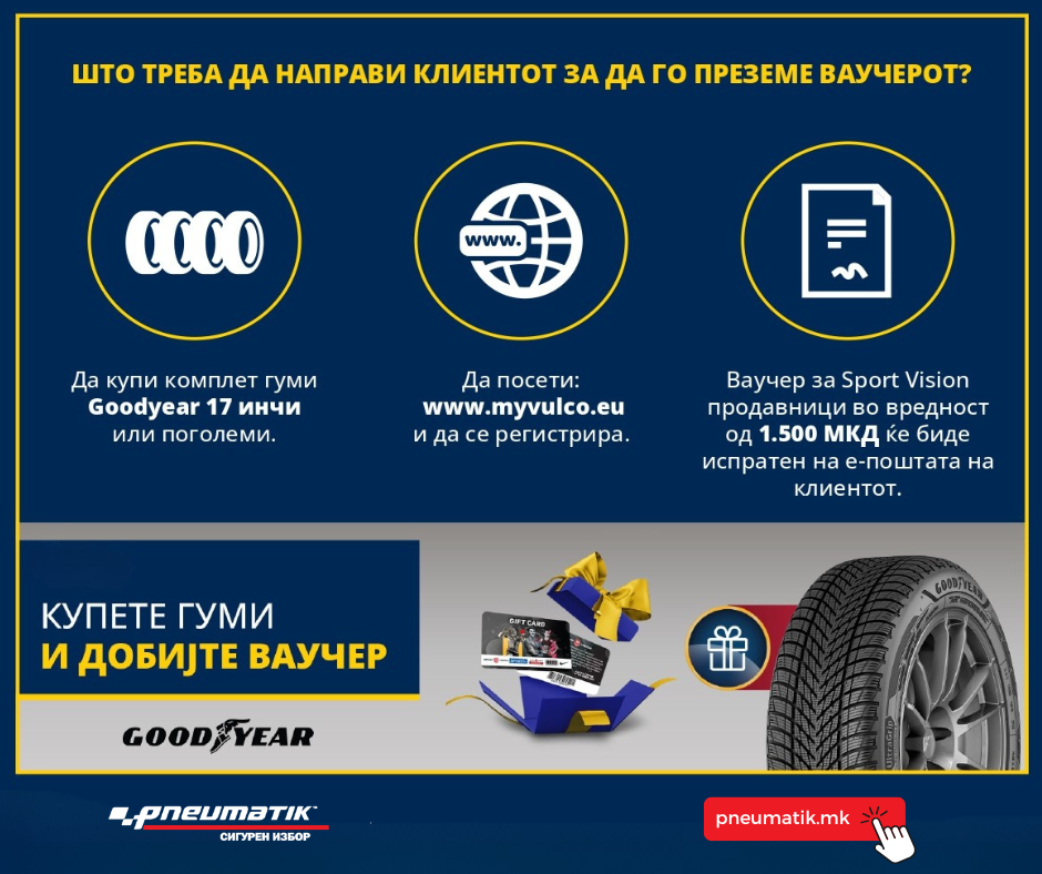 Во период од 15.11.2025, со купување на 4 Goodyear пневматици со димензија 17" или поголеми во продажните салони на Пнеуматик, добивате ваучер во вредност од 1.500 ден. кој може да го искористите во продавниците на Sport Vision. Акцијата трае до потрошување на залихата на ваучери.